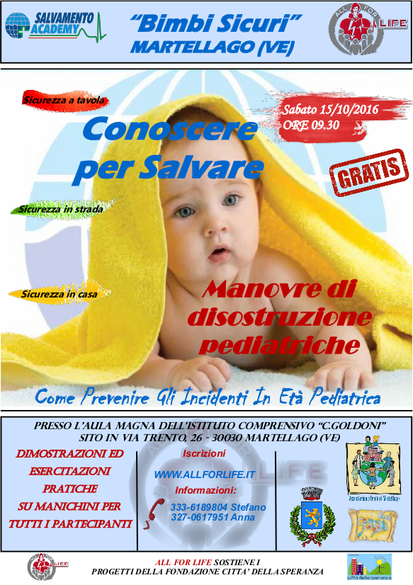 Per questo, presso l'aula magna dell'I.C. "C.Goldoni" a Martellago, il 16/02/2013, il 22/03/2014, il 28/02/2015 ed il 16/03/2019, l'Associazione ha organizzato un incontro pubblico con la partecipazione, quali relatori, di alcuni operatori della C.R.I. che hanno attuato una lezione interattiva sulle manovre corrette per la disostruzione delle vie aeree e la rianimazione in età pediatrica.