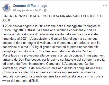 La manifestazione denominata "Passeggiata Ecologica" rappresenta un'intensa giornata di vita insieme ed in contatto nella natura. L'evento nasce nel 1995, è privo di scopo di lucro e di qualsivoglia finalità di carattere commerciale e si svolge nell'arco di un giorno. La manifestazione è organizzata dall'"Associazione Genitori Martellago", con la collaborazione dell'Amministrazione Comunale, degli Istituti Comprensivi "C.Goldoni" e "G.Matteotti" e di altre realtà associative del territorio. L'iniziativa ha ricevuto, nel tempo diversi patrocini, dal: Comune di Martellago (VE), dal Centro di Servizio per il Volontariato della provincia di Venezia, dal Coordinamento delle Associazioni di Volontariato della Provincia di Venezia e da parte della Regione del Veneto e dalla Provincia di Venezia.