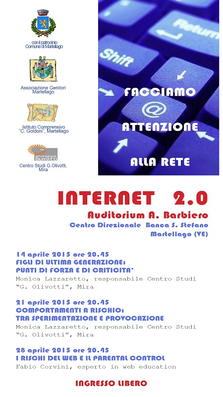 MERCOLEDÌ 17 novembre 2010, presso l''aula magna dell'Istituto Comprensivo "Carlo Goldoni" di Martellago, l'Associazione Genitori Martellago ed il Consiglio d'Istituto ha promosso un incontro a tema: "Internet, social network e cellulari: evitiamo l'uso improprio!!!". All'evento, rivolto ai ragazzi delle scuole medie, hanno partecipato agenti della Polizia Postale e varie Autorità. L'incontro è stato ripetuto, MERCOLEDÌ 15 dicembre 2010, con una serata a tema rivolta ad un pubblico adulto, sullo stesso argomento. Il risultato è stato eccellente con un'aula stracolta ed un pubblico molto attento ed interessato.