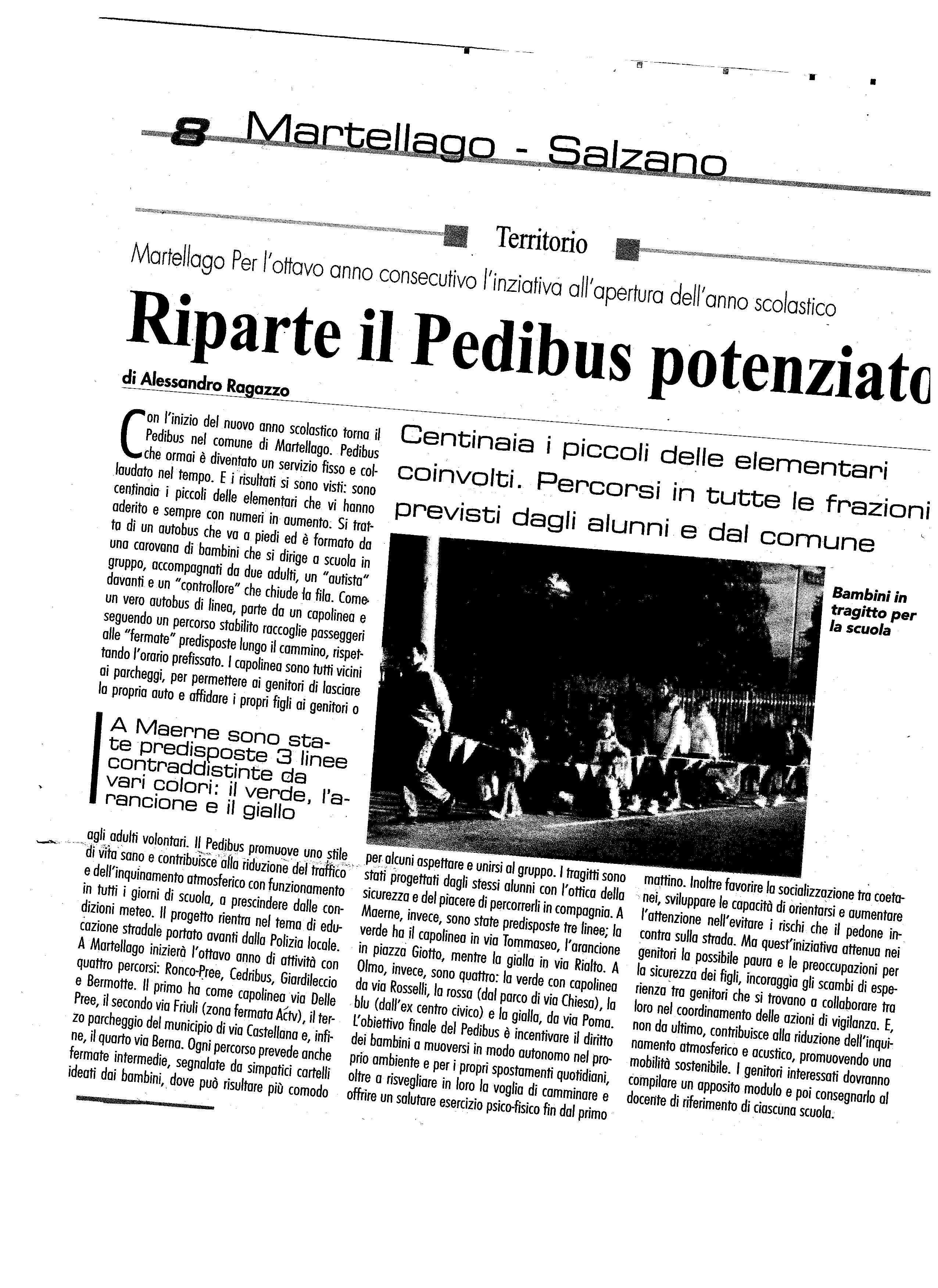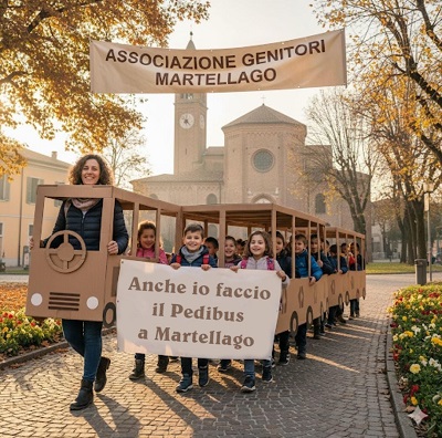 Il Piedibus è il modo più sano, sicuro, divertente ed ecologico per andare a scuola. È un autobus umano, formato da un gruppo di bambini “passeggeri” e da due o più adulti “autisti” e “controllori”. Il Piedibus è un progetto che nasce in Danimarca. È attivo in Nord Europa e negli Stati Uniti e si sta diffondendo in moltissimi altri paesi. Anche in Italia si inizia a parlare di Piedibus ed a Martellago l’iniziativa si sviluppa grazie all’Ass. Genitori Martellago, all’Amministrazione Comunale ed alla scuola nel 2004.